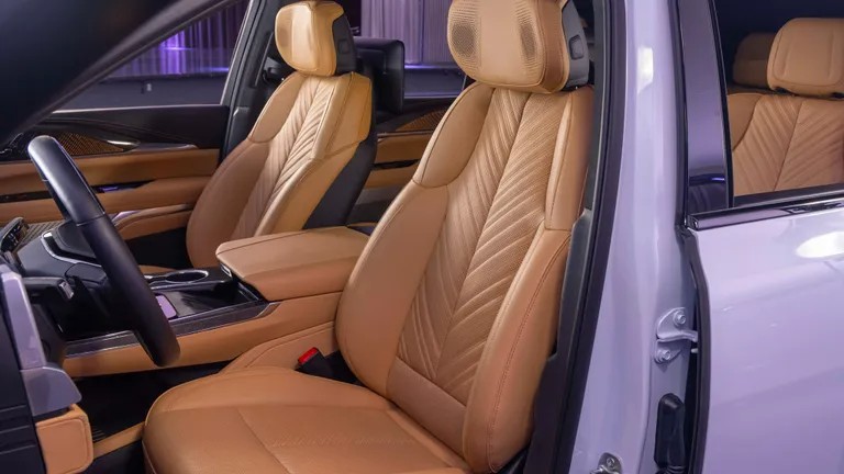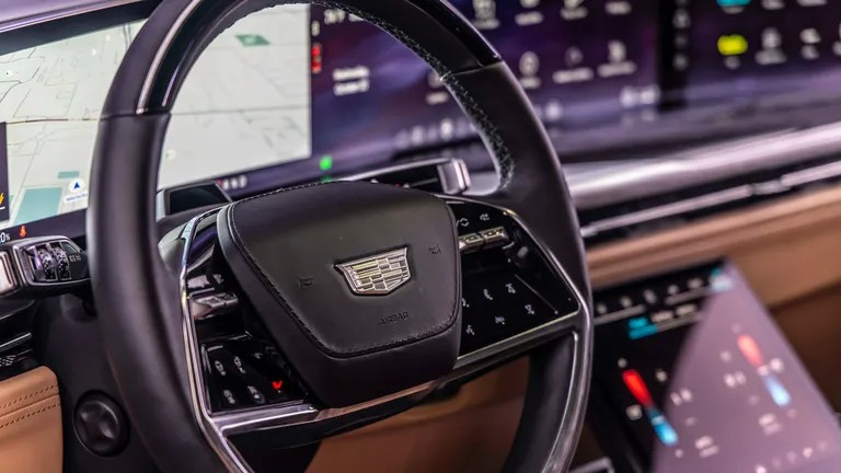 سیستم تعلیق کادیلاک اسکالید IQ نیز از فنرهای بادی با قابلیت تنظیم ارتفاع و کمکفنرهای Magneride بهره میبرد که سواری نرم و کنترلشدهای را ارائه میدهد. سیستم فرمان چهار چرخ (Four-Wheel Steering) باعث میشود این شاسیبلند بزرگ در فضاهای تنگ، حتی از Tesla Model Y نیز چابکتر عمل کند. حالت “Arrival” با کاهش ارتفاع تعلیق و چرخاندن همزمان چرخهای جلو و عقب در سرعتهای پایین، امکان حرکت مورب خودرو را فراهم میکند.