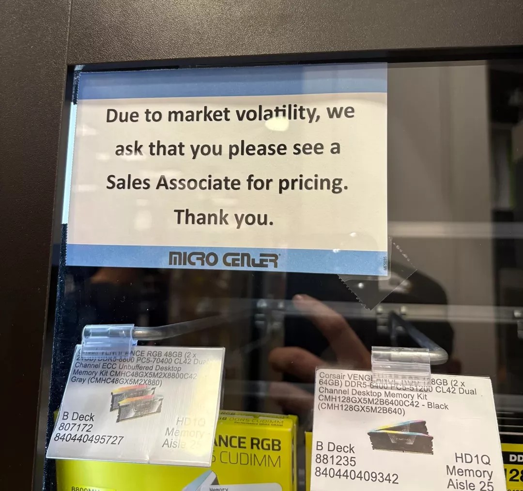 هماکنون، یک کیت ۶۴ گیگابایتی G.Skill Trident Z5 DDR5 6000 در فروشگاه Newegg با قیمت ۵۹۹ دلار عرضه میشود که ۲۰۰ دلار گرانتر از پلی استیشن ۵ دیجیتال است. این قیمت پیشتر ۶۴۰ دلار بود. ردیاب قیمت Amazon نیز نشان میدهد که قیمت Crucial Pro DDR5 6000 از ۱۳۹ دلار در تابستان به ۴۹۷ دلار افزایش یافته است. به دلیل نوسانات شدید روزانه، فروشگاههای فیزیکی مانند Central Computers و Micro Center دیگر قیمت ثابت برای ماژولهای رم کامپیوتر درج نمیکنند و مشتریان را برای اطلاع از قیمت به کارمندان ارجاع میدهند.