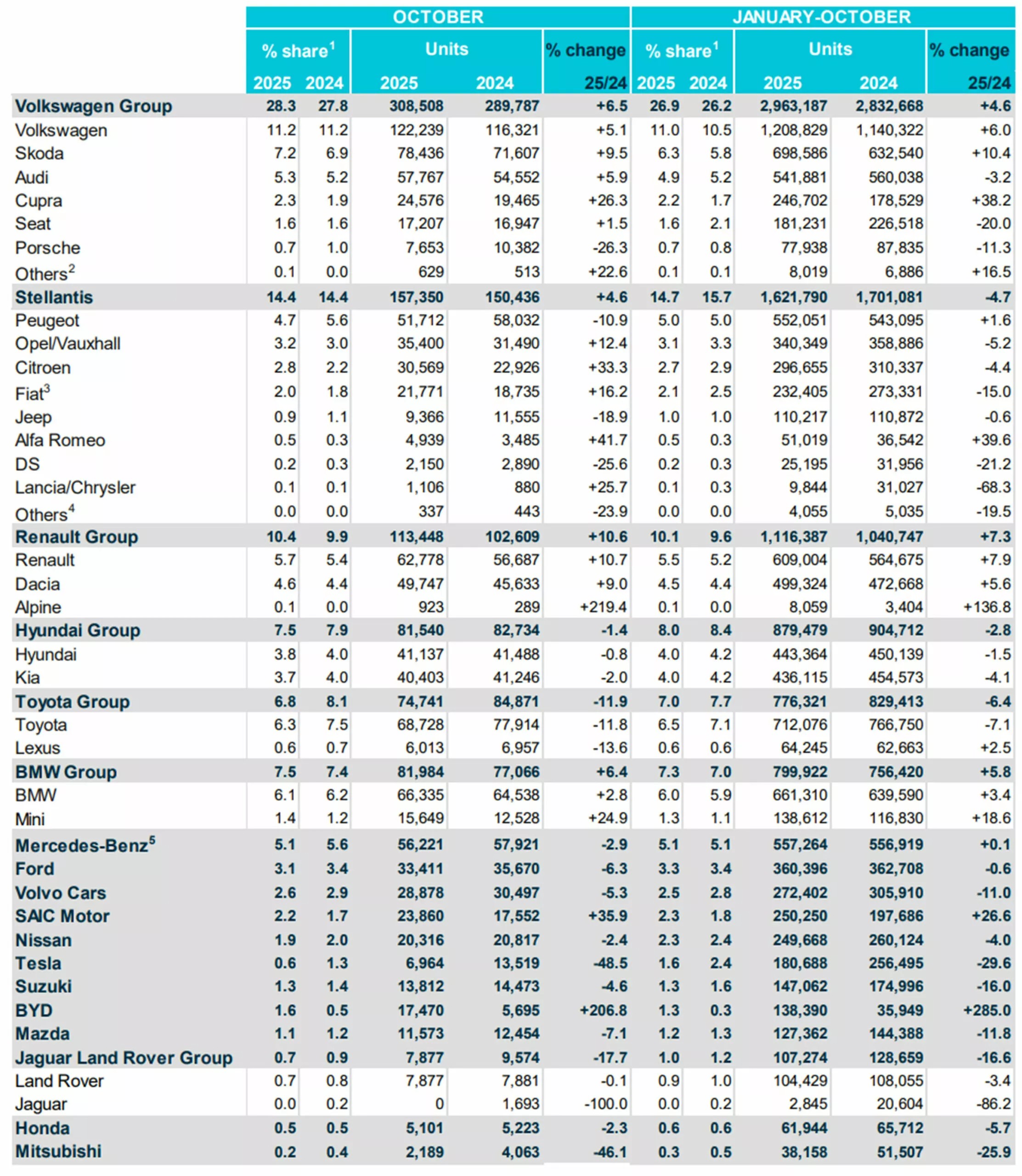 در ماه اکتبر، خودروسازان چینی سهم ۶.۸ درصدی از کل فروش خودروهای جدید در اتحادیه اروپا، بریتانیا و کشورهای EFTA را به خود اختصاص دادند. این رقم با فروش حدود ۷۵ هزار دستگاه خودرو از برندهای چینی محقق شده است. در میان این برندها، SAIC نیز ماه موفقی را پشت سر گذاشت و فروش آن از ۱۷,۵۵۲ دستگاه در اکتبر سال گذشته به ۲۳,۸۶۰ دستگاه در اکتبر سال جاری رسید.