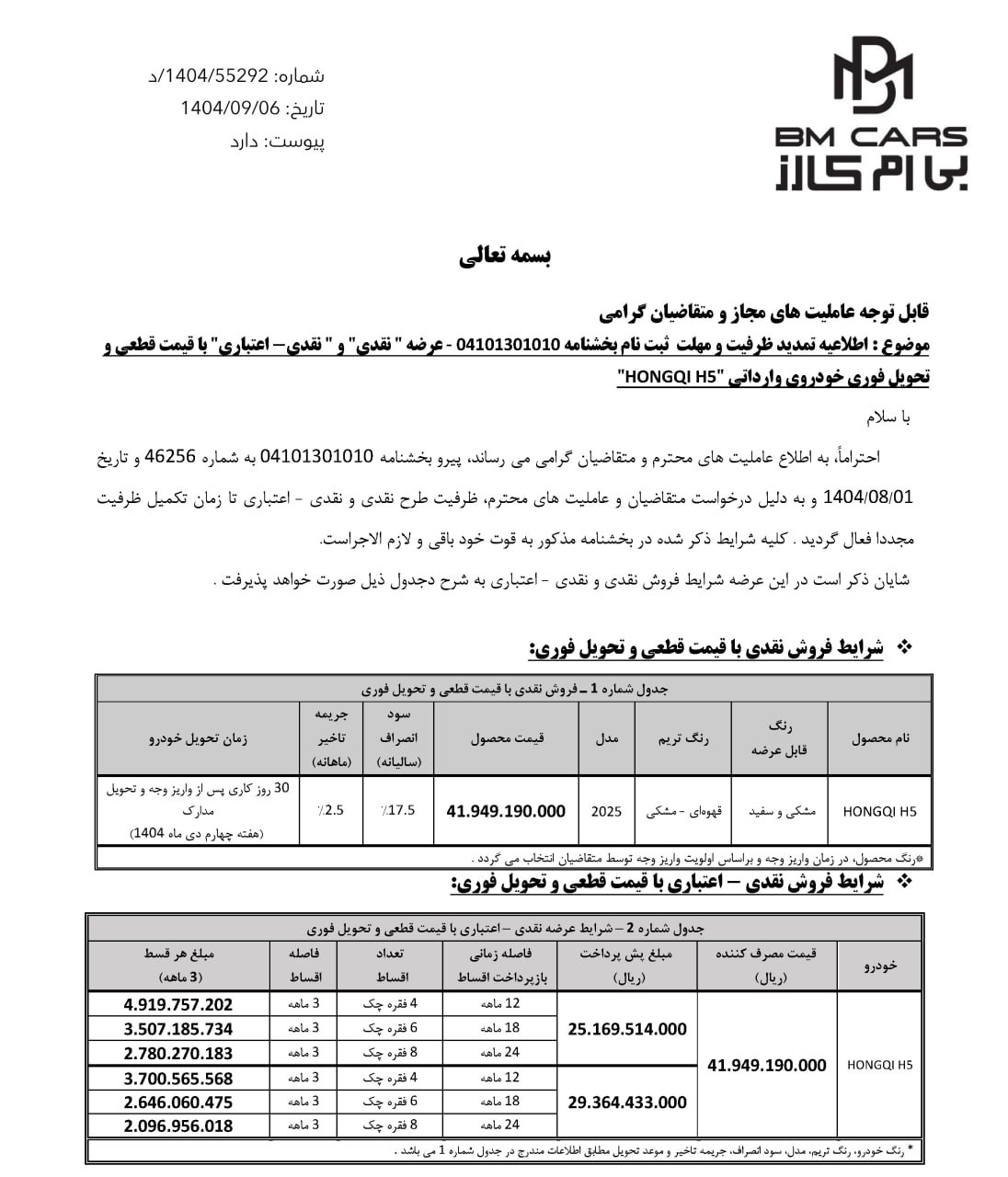 - شرایط فروش نقد و اقساط هونگچی H5 – آذر 1404