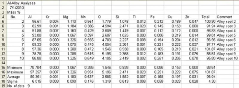 کیمبلر یافتههای خود را برای آزمایش به آزمایشگاههای مختلفی فرستاد. در اولین آزمایشها توسط «نیومکزیکو تک» در سوکورو، مشخص شد که این ماده آلیاژی از آلومینیوم، سیلیکون، منگنز و مس است. اگرچه این مواد ناشناخته نبودند، اما شکل ورقهای آن غیرعادی گزارش شد.