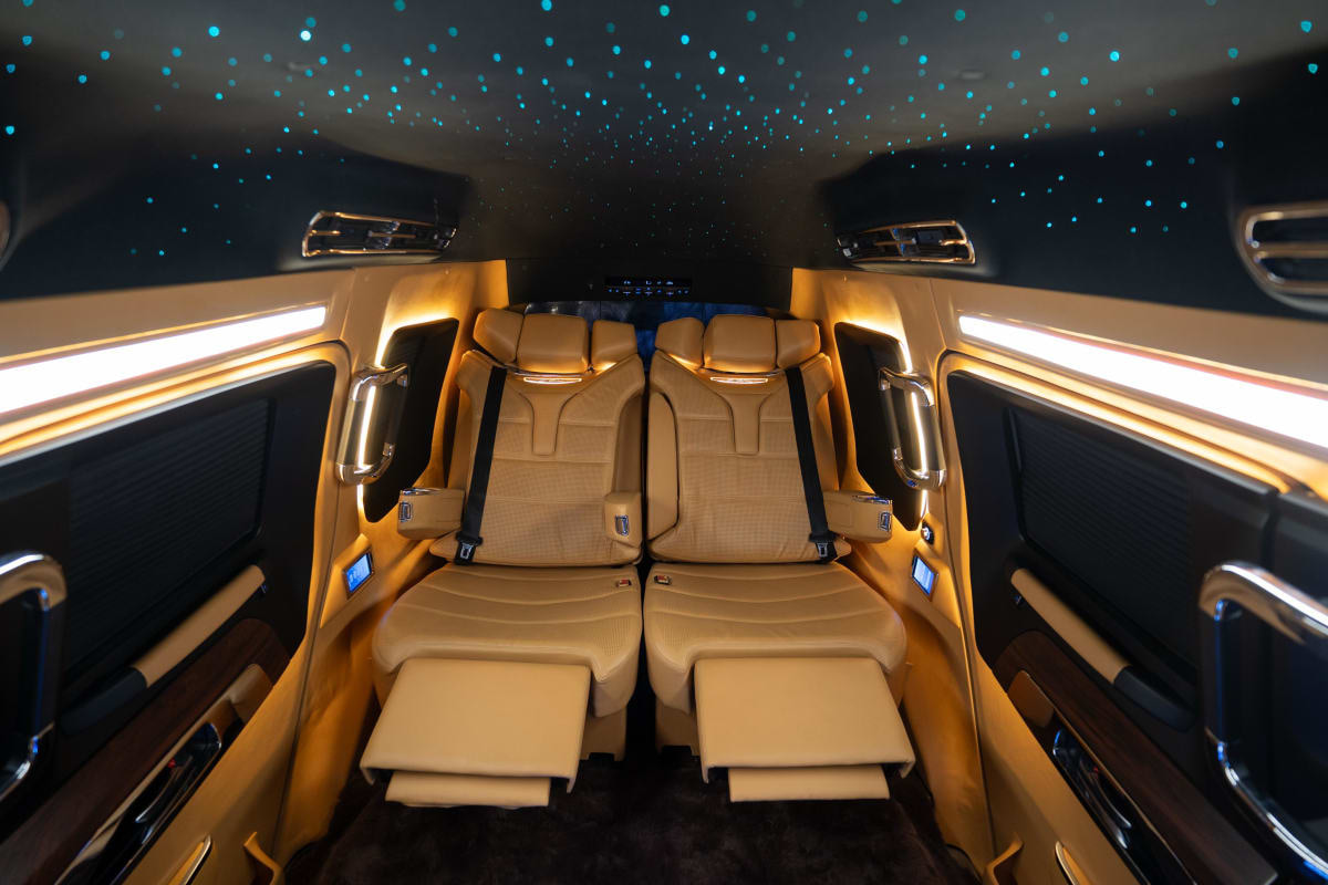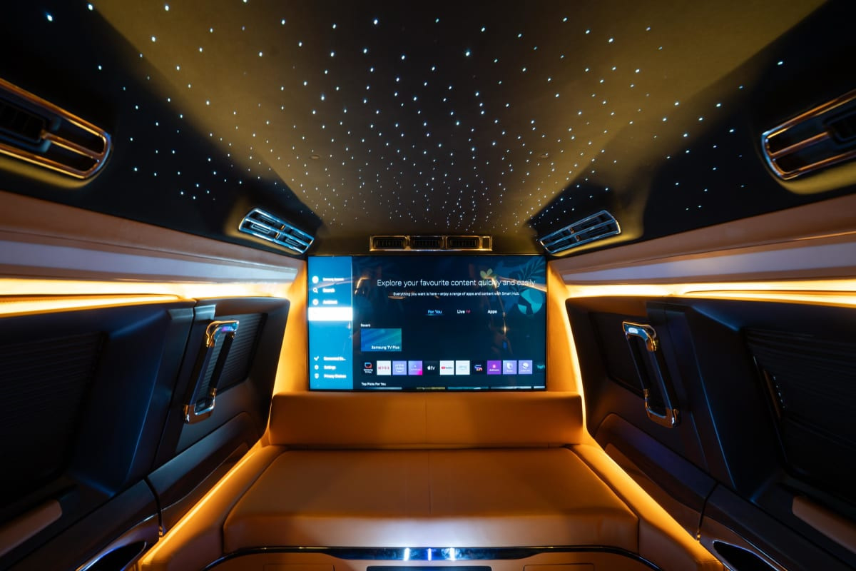 روبهروی این صندلیها، یک کاناپه پهن و نرم با پوشش چرمی دولایه تعبیه شده که برای گفتوگو یا استراحت جمعی طراحی شده است. اما جلوه اصلی این کابین، سقف کهکشانی با الهام از طراحی رولزرویس است. صدها چراغ LED ظریف همچون ستارههایی میدرخشند و حالتی آرامشبخش به فضا میبخشند. در بخش مرکزی نیز یک نمایشگر غولپیکر جداکننده نصب شده که راننده را از ناحیه سرنشینان متمایز میکند. افزوده شدن پردههای برقی، کفپوشهای ضخیم و نورپردازی چندحالته در این نسخه سطح تجمل و حریم شخصی را به اوج رسانده است.