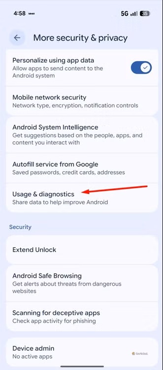 گزینه Usage and Diagnostics که بهطور پیشفرض در اکثر دستگاههای اندرویدی فعال است، بهطور مداوم اطلاعاتی از عملکرد و نحوه استفاده شما از گوشی به گوگل ارسال میکند. این دادهها شامل مواردی نظیر عملکرد باتری، پایداری نرمافزار و میزان استفاده از برنامههاست. اگرچه این اطلاعات به گوگل در بهبود اکوسیستم اندروید کمک میکند، اما برای حفظ حریم خصوصی اندروید توصیه میشود این گزینه را غیرفعال کنید، زیرا مشخص نیست کدام یک از دادههای به اشتراک گذاشته شده ممکن است اطلاعات شما را به خطر بیندازد.