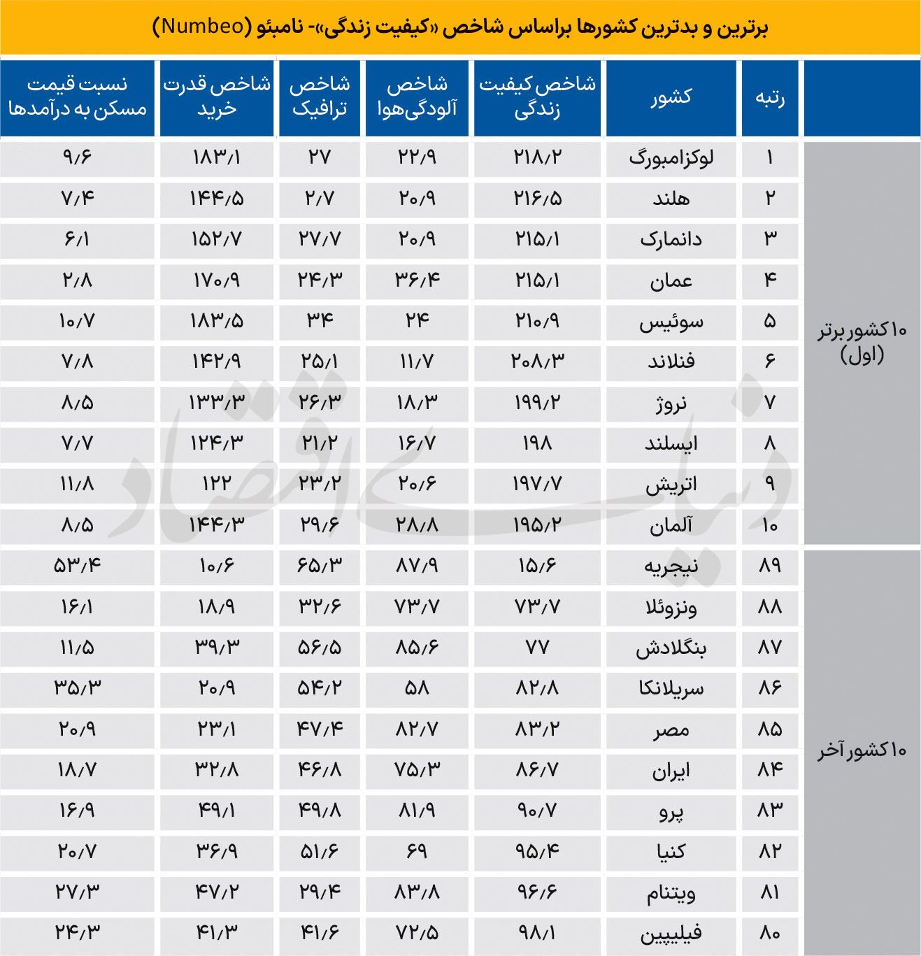 در سوی دیگر این مقیاس، کشورهایی همچون لوکزامبورگ، هلند، دانمارک، عمان، سوئیس، فنلاند و نروژ در صدر جدول کیفیت زندگی قرار دارند. نقطه اشتراک این کشورها، عملکرد مستمر و قوی در ۹ زیرشاخص کلیدی از جمله ثبات اقتصادی، درآمد سرانه بالا، امنیت اجتماعی، سلامت عمومی، زیرساختهای کارآمد، آموزش باکیفیت، پاکیزگی محیطزیست و شفافیت نهادی است. در این کشورها حملونقل عمومی گسترده و استاندارد، دسترسی آزاد به خدمات درمانی و تعهد دولتها به توسعه پایدار سبب شده زندگی روزمره شهروندان از فشارهای اقتصادی و زیستمحیطی تا حد زیادی مصون بماند.