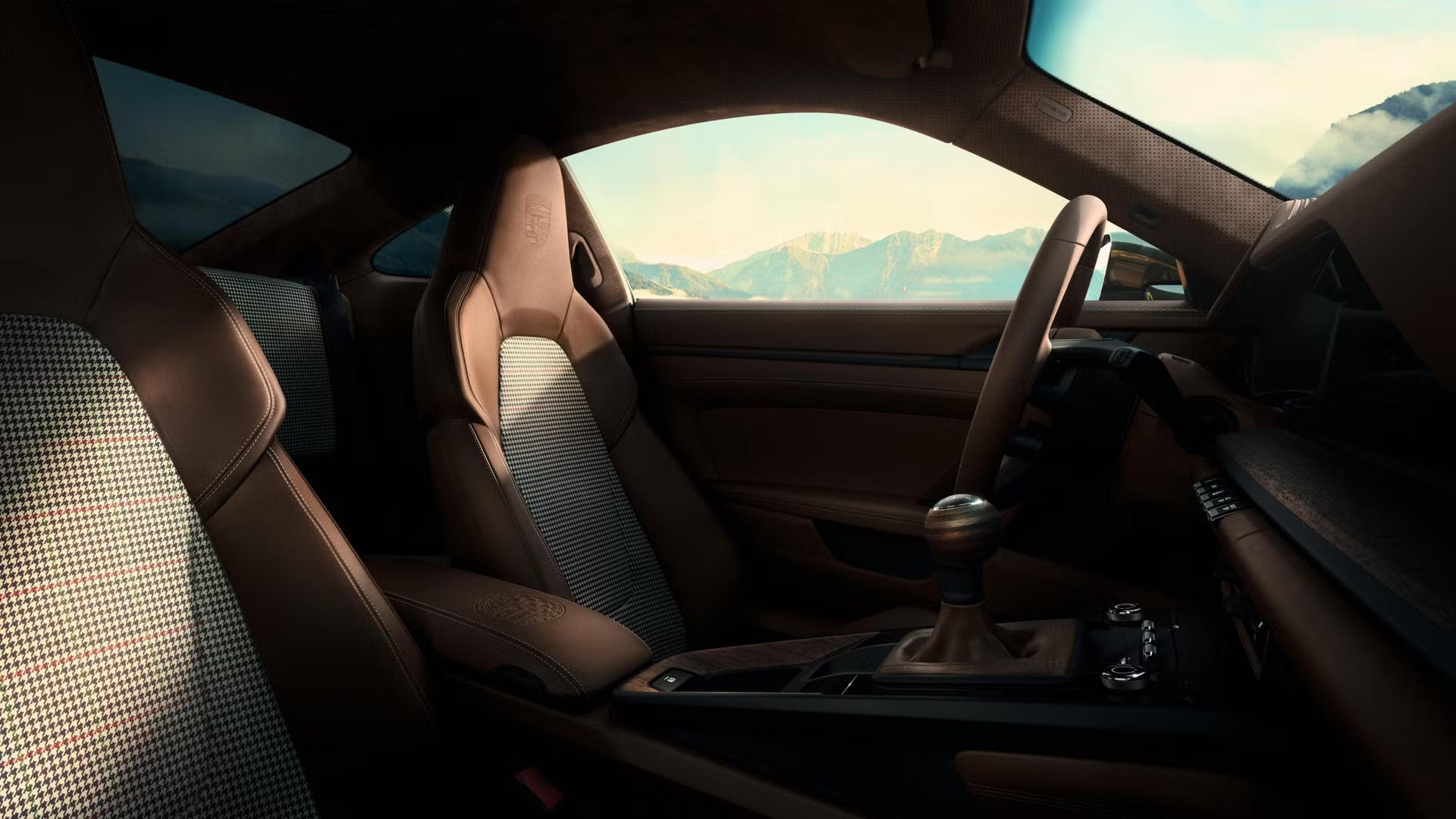 در داخل کابین، طراحان پورشه سنگ تمام گذاشتهاند. تریم داخلی ترکیبی از چرم Truffle Brown و پارچههای چهارخانه خاصی به نام “F. A. Grid-Weave” است. این پارچه که در مرکز صندلیها، پنل درها و داشبورد به کار رفته، مستقیماً از طرح کتهای مورد علاقه فردیناند الکساندر الگوبرداری شده است. استفاده از چوب گردوی مات برای دسته دنده و امضای حک شده بوتزی روی داشبورد، حس گرما و صمیمیت خاصی به فضای داخلی بخشیده است که در مدلهای استاندارد جیتی۳ کمتر دیده میشود.