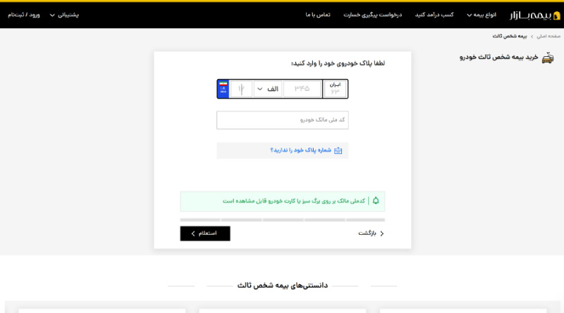 کافیست وارد سایت یا اپ بیمه بازار شوید و بخش مربوط به استعلام بیمه شخص ثالث را انتخاب کنید.