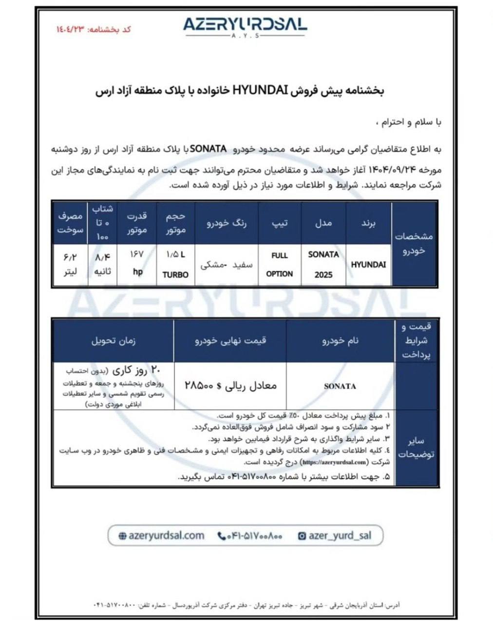 هیوندای سوناتا مدل 2025 با قیمت قطعی که معادل ریالی 28 هزار و 500 دلار خواهد بود به فروش میرسد. موعد تحویل این محصول حداکثر 20 روز کاری اعلام شده است. (بدون احتساب روزهای پنجشنبه و جمعه و تعطیلات رسمی تقویم شمسی و سایر تعطیلات ابلاغی موردی دولت) مبلغ پیش پرداخت معادل 50 درصد قیمت کل خودرو است و سود مشارکت و انصراف شامل فروش فوق العاده نمیگردد.