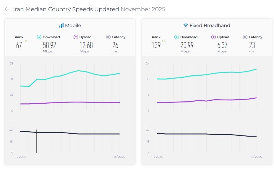 طبق جدیدترین آمار منتشر شده توسط وبسایت مرجع اسپیدتست (Speedtest) برای ماه نوامبر ۲۰۲۵، وضعیت اینترنت کشور با بهبود نسبی همراه بوده است. گزارشها حاکی از آن است که سرعت اینترنت ایران در هر دو بخش ثابت و سیار رشد داشته و توانسته در ردهبندی جهانی ۵ پله صعود را تجربه کند. این در حالی است که میانگین جهانی سرعت دانلود موبایل به ۱۰۳.۰۱ و اینترنت ثابت به ۱۱۵.۴۳ مگابیت بر ثانیه رسیده است.