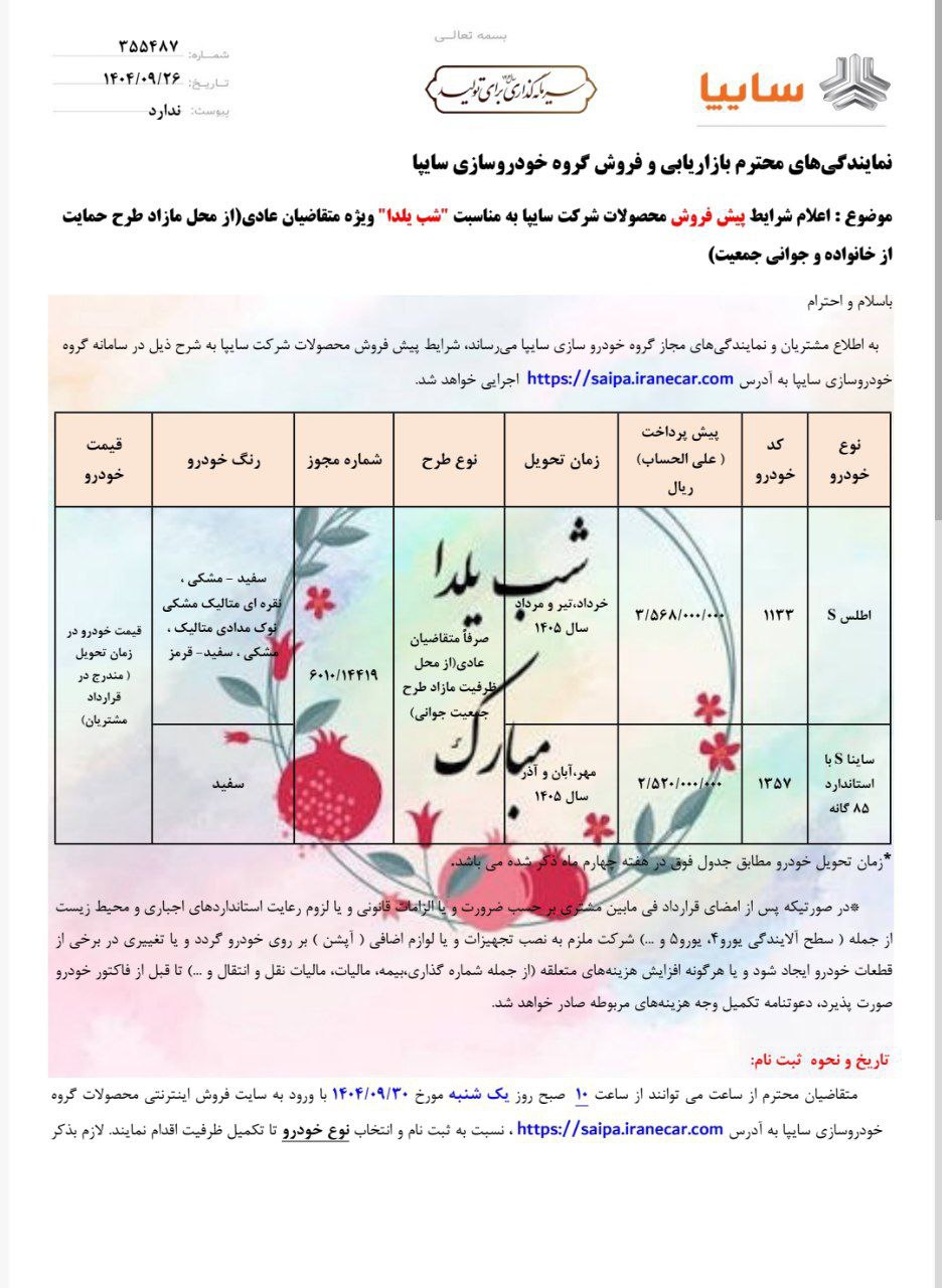 گروه صنعتی سایپا با انتشار یک بخشنامه جدید، شرایط پیش فروش دو محصول اطلس S و ساینا S را ویژه یلدا 1404 اعلام کرد. کلیه متقاضیان شرکت در این طرح میتوانند از ساعت 10 صبح روز یک شنبه مورخ 30 آذر تا زمان تکمیل ظرفیت، نسبت به ثبت نام و واریز پیش پرداخت اقدام کنند.