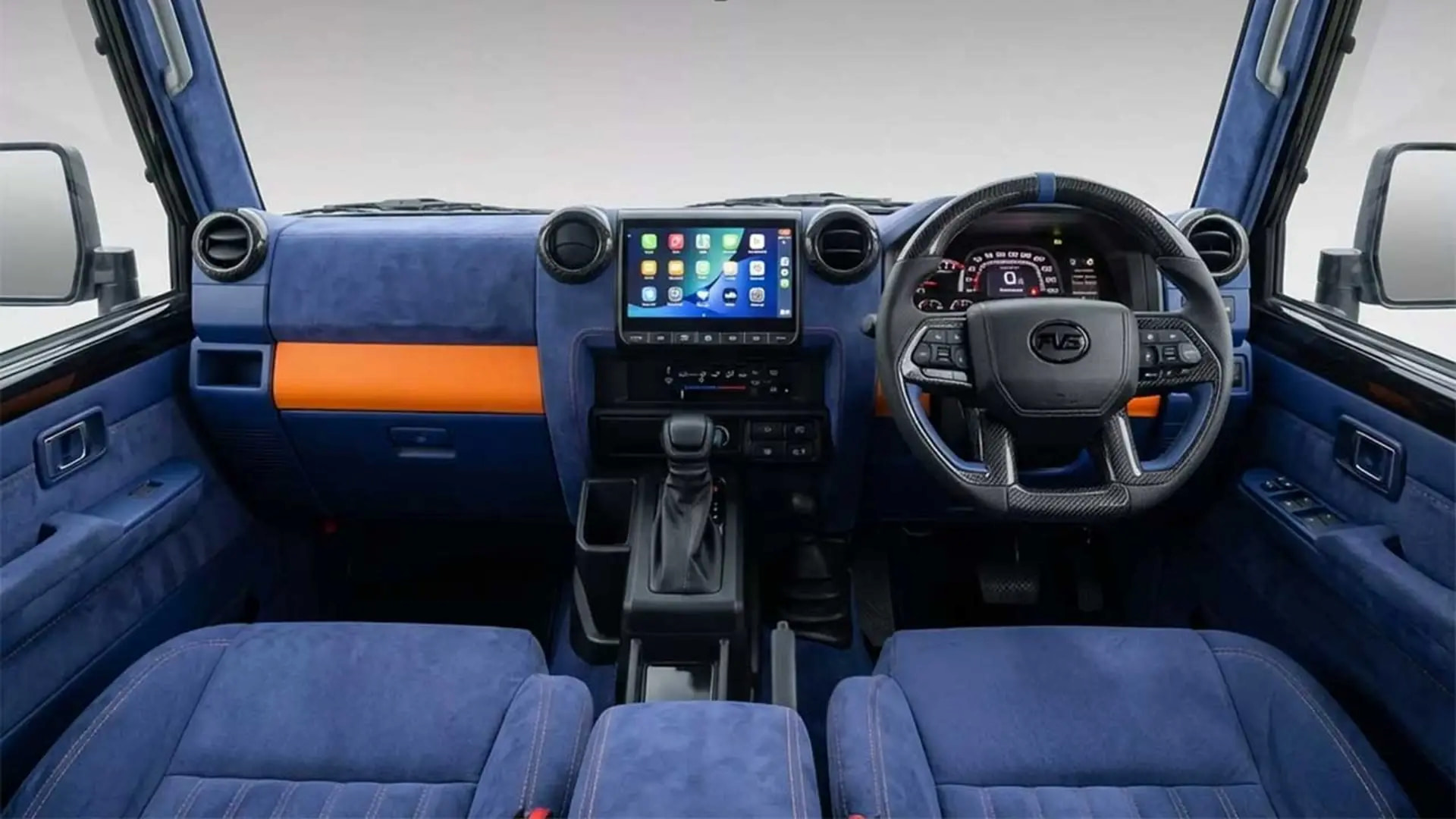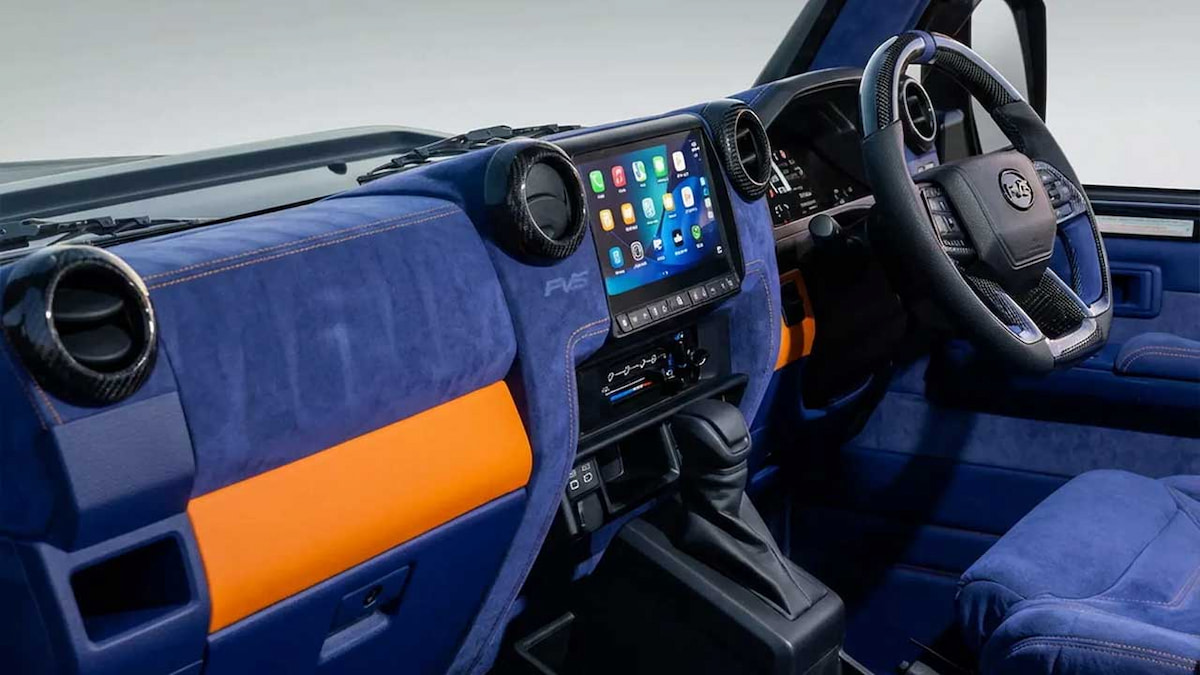 بزرگترین تغییر در پروژه تویوتا لندکروزر سری ۷۰ تیونشده شرکت PVS Automotive نه در نمای بیرونی، بلکه درون کابین آن رخ داده است. در اینجا فلسفه کاربردی و سادگی طراحی تویوتا بهکلی کنار گذاشته شده تا جای خود را به فضایی بدهد که بیشتر یادآور اتاق مفهومی یک خودرو آیندهنگر لوکس است تا کابین یک شاسی بلند سنتی آفرودر. بهجای داشبورد و تزئینات خشن کارخانهای، اکنون هر سطح و جزئیات داخلی با آلکانترای آبی تیره پریمیوم پوشانده شده است.