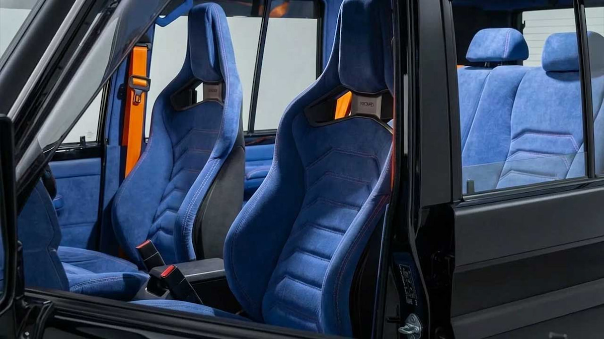 این ترکیب پارچه نرم جیرمانند با رنگی عمیق و آرامشبخش، فضایی بهشدت لوکس و مدرن پدید آورده که تضاد عجیبی با ذات آفرودی این خودرو دارد. صندلیهای استاندارد حذف و جای خود را به صندلیهای مسابقهای Recaro Cross GK100 دادهاند؛ محصولی که در خودروهای رالی و اسپرت دیده میشود و با ساختار ارگونومیک خود حمایت جانبی فوقالعادهای در مسیرهای ناهموار ارائه میدهد.