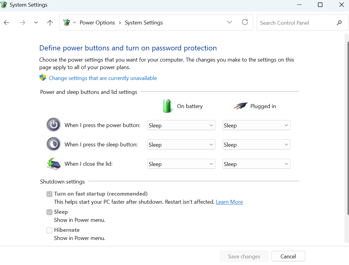 - تیک گزینه Turn on fast startup را بردارید و تغییرات را ذخیره کنید.