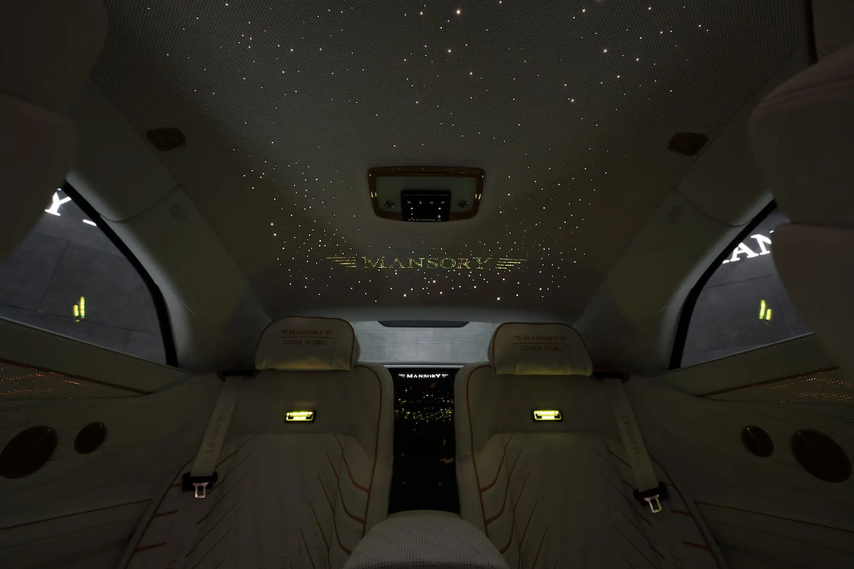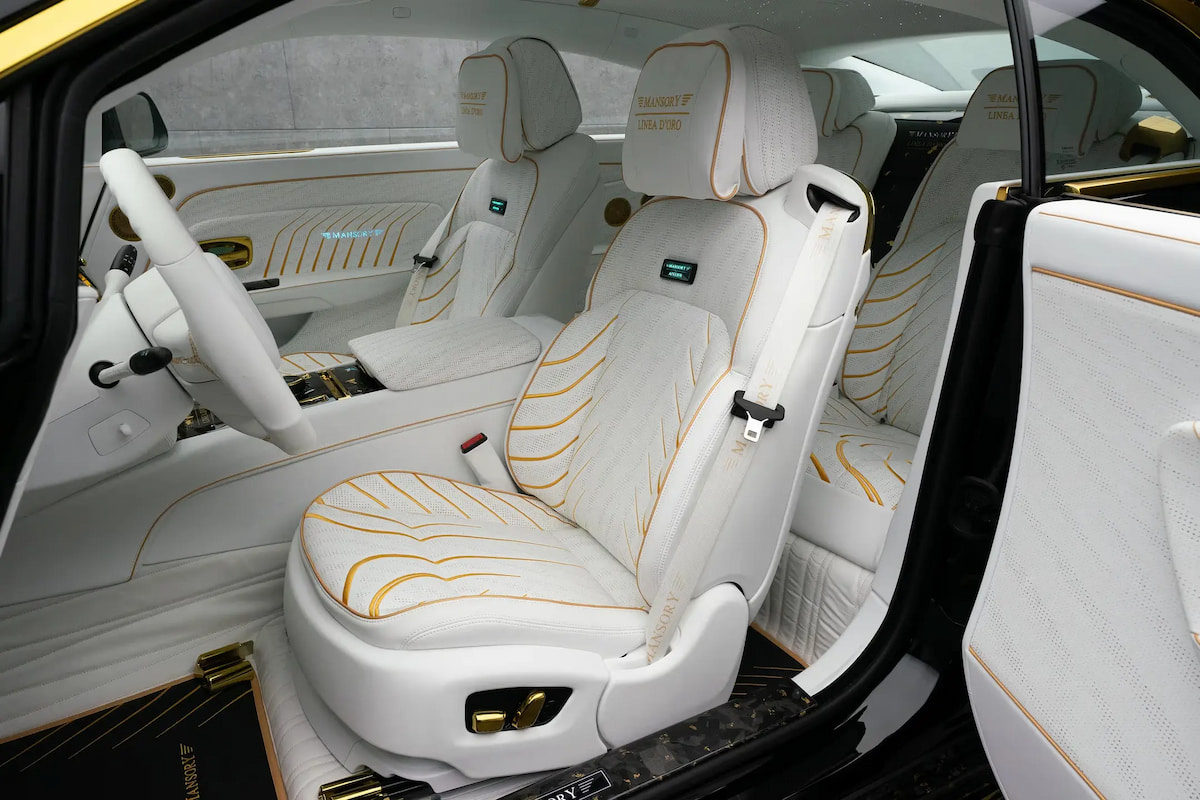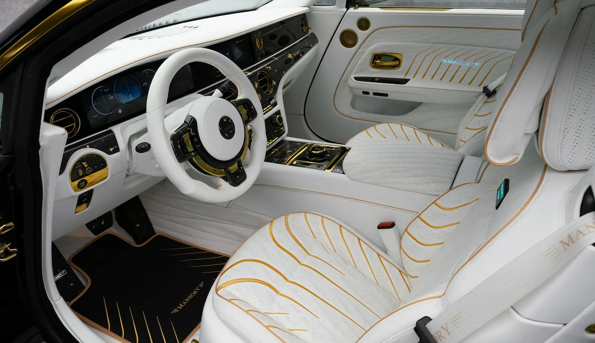 داخل کابین نیز این نمایش پرزرقوبرق ادامه دارد و بهمراتب چشمگیرتر میشود. صندلیهای با چرم سفید ناب در کنار دوختهای طلایی دستدوز و نوارهای متالیک تصویری از ظرافت لوکس و جسارت بصری را ارائه میدهند. در برابر راننده، داشبورد و کنسول میانی با ترکیبی از فیبر کربن براق و ورقههای طلای تزئینی تزیین شدهاند و فرمان هم در همین زبان طراحی بازآفرینی شده است. اما اوج هنرنمایی منصوری در وسواس مثالزدنی او نسبت به جزئیات است؛ تا جایی که حتی قاب بلندگوها، کلیدهای کنترلی و دستهی چترهای مخصوص رولزرویس هم تماماً از طلا ساخته شدهاند.