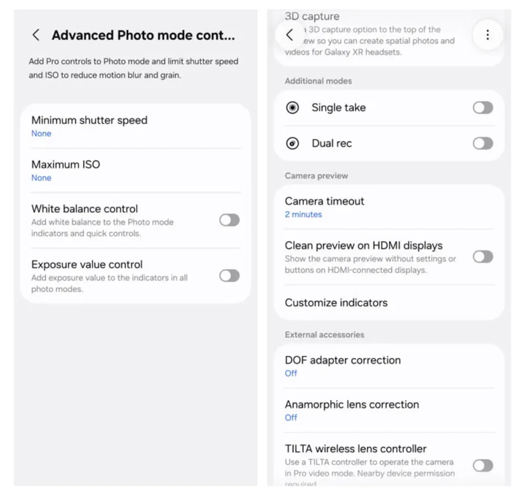 علاوه بر رفع مشکل تاری، سامسونگ ویژگیهای محبوبی مثل Single Take و Dual Recording را که در نسخه بتای قبلی حذف شده بودند، بازگردانده است؛ اما این بار به عنوان گزینههای اختیاری در Camera Assistant تا رابط کاربری اصلی خلوت بماند. همچنین قابلیت جدیدی برای اشتراکگذاری تنظیمات دوربین (Pro Mode Presets) اضافه شده که به عکاسان اجازه میدهد «دستورالعملهای» نوری خود را مانند فیلترهای فوجیفیلم با دیگران به اشتراک بگذارند.
