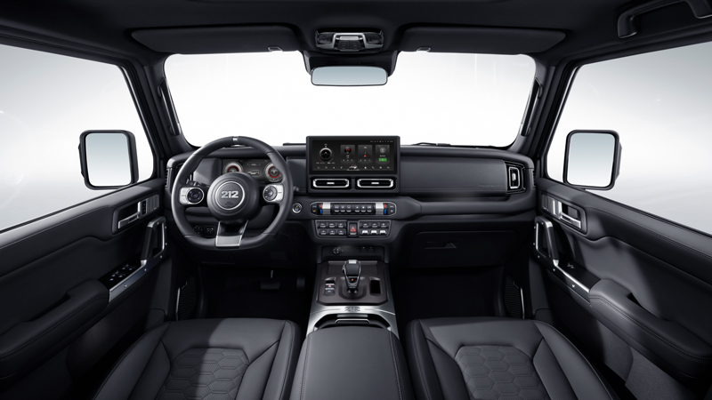 غربیلک فرمان D شکل با کلیدهای کنترلی، به خودرو حالوهوای مدرنتری بخشیده است. در بخش میانی داشبورد مجموعهای از کلیدها برای کنترل حالتهای آفرودی، قفل دیفرانسیلها، انتخاب حالتهای رانندگی و سیستم چهار چرخ محرک قرار گرفته است؛ چیدمانی که حس کابین یک خودروی نظامی یا آفرود حرفهای را به راننده القا میکند.