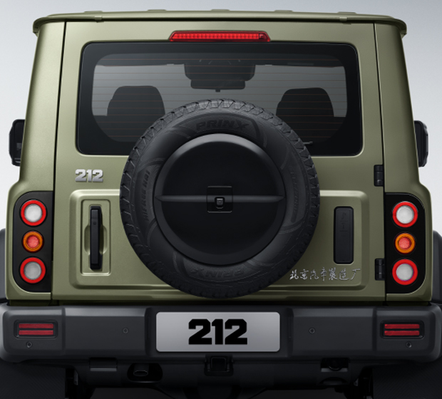 در بخش عقب، لاستیک زاپاس روی در صندوق عقب نصب شده که هم سنت خودروهای آفرودی را ادامه میدهد و هم از نظر فضای کابین و سهولت دسترسی کاربردی است. چراغهای گرد عقب با نوارهای LED روی گلگیرها تکمیلکننده سبک کلاسیک خودرو هستند. حضور رکاب جانبی، آینههای بزرگ، لاستیکهای آلتراین (All-Terrain) و ارتفاع زیاد از سطح زمین، در همان نگاه اول به شما میگوید که BAW 212 برای مسیرهای معمولی ساخته نشده است.