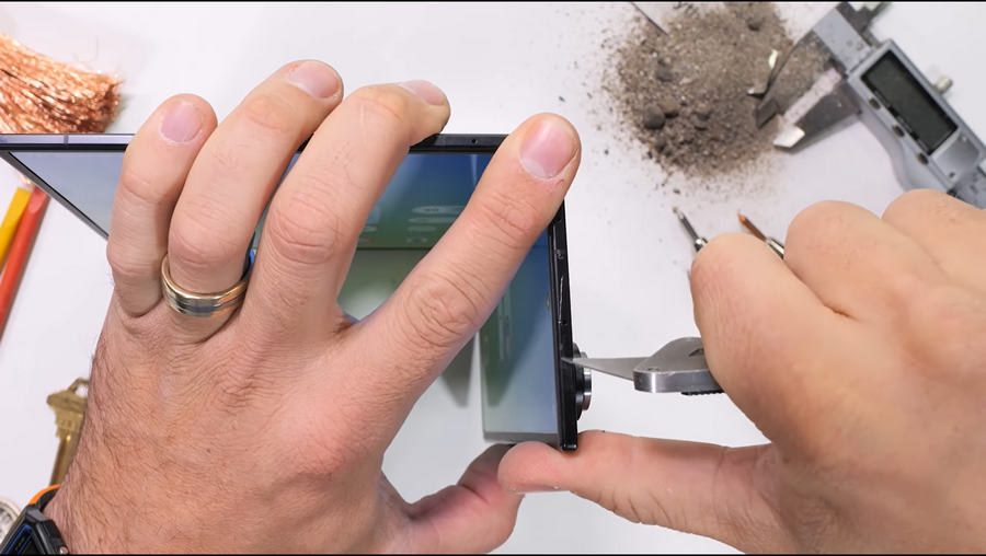 در مرحله تست شن و ماسه، لولاهای دستگاه بلافاصله آسیبپذیر نشان دادند و صدای خرد شدن ذرات شن در هنگام باز و بسته کردن به وضوح شنیده میشد که نشان از نفوذپذیری بالای آن دارد. اما فاجعه اصلی در تست خم شدن رخ داد. بدنه بسیار باریک این گوشی تاشو سه تیکه سامسونگ که از جنس آلومینیوم تقویتنشده در نقاط حساس بود، نتوانست فشار معکوس را تحمل کند. فریم دستگاه دقیقاً از محل خطوط آنتن دچار شکستگی شد و نمایشگر بزرگ آن با پارگی پیکسلها برای همیشه خاموش شد.