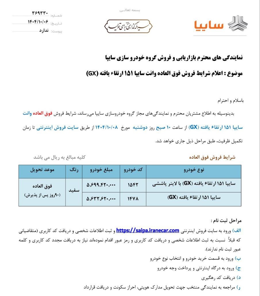 گروه خودروسازی سایپا با انتشار یک بخشنامه جدید، شرایط فروش وانت سایپا 151 ارتقایافته (GX) را برای دی ماه 1404 اعلام کرد. کلیه علاقهمندان به خرید این خودرو میتوانند از ساعت 10 صبح روز دوشنبه مورخ 8 دی تا زمان تکمیل ظرفیت، نسبت به ثبت نام و واریز وجه اقدام کنند.
