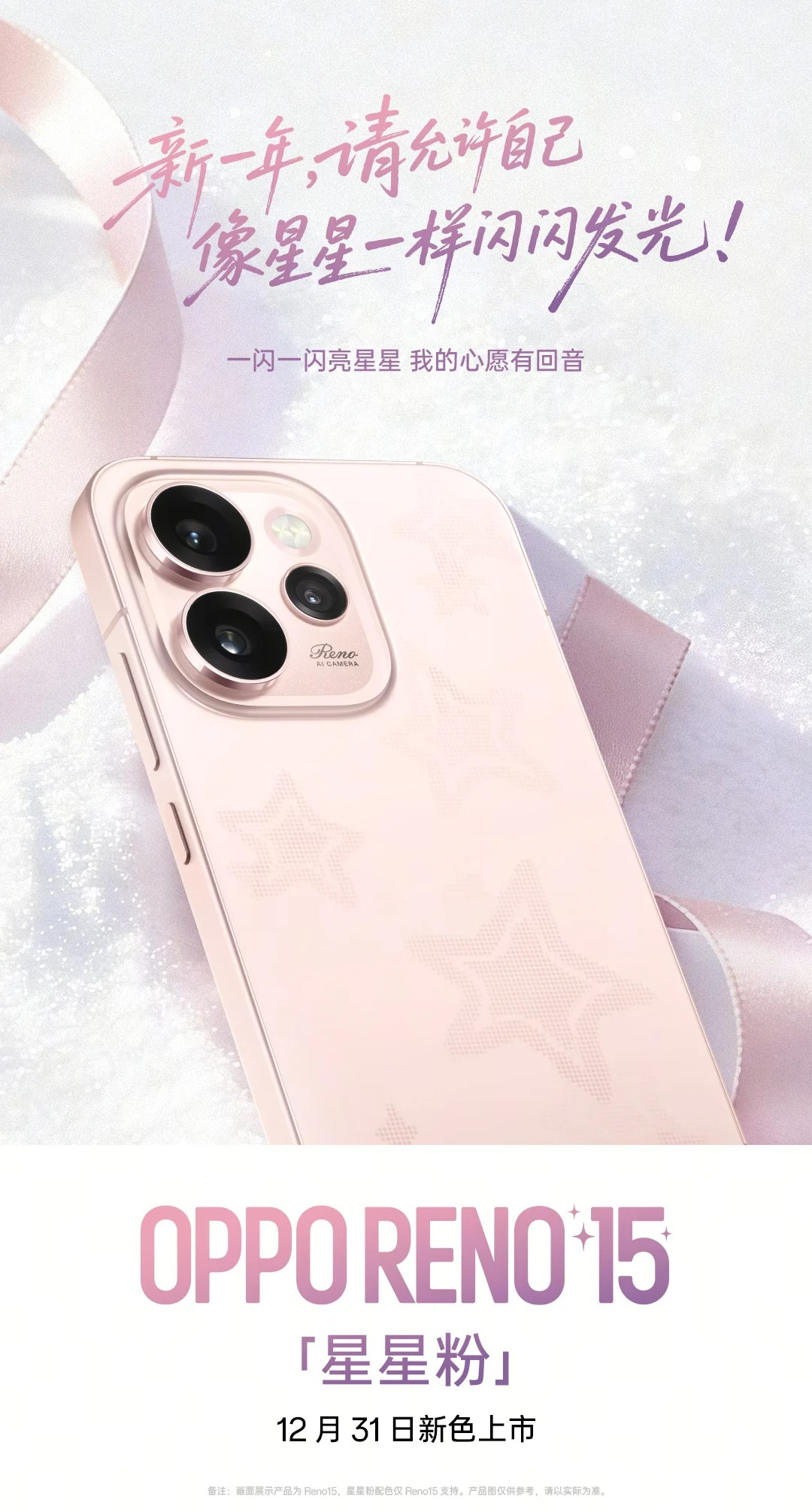 مدل صورتی ستارهای گوشی اوپو رینو ۱۵ با تمرکز بر طراحی بصری معرفی شده است. پنل پشتی این گوشی از فرآیند «شبکه ستارهای» بهره میبرد که جلوهای درخشان و ستارهمانند با تغییر زاویه دید ایجاد میکند. این نسخه از نظر سختافزاری با مدلهای قبلی Reno 15 یکسان است. فروش آن از ۳۱ دسامبر ۲۰۲۵ (۱۰ دی ۱۴۰۴) در چین آغاز میشود و پیشسفارشات فعال هستند. سری رینو ۱۵ در نوامبر با سه رنگ دیگر معرفی شده بود.