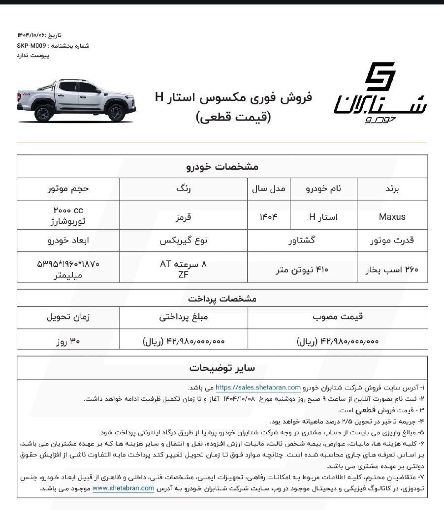 در این طرح قرار است پیکاپ مکسوس استار اچ با قیمت قطعی 4 میلیارد و 298 میلیون تومان و با موعد تحویل 30 روزه به فروش برسد. مشتریان برای ثبت نام باید به نشانی شرکت sales.shetabran.com مراجعه کرده و فرآیند مشخصی را طی کنند. جریمه تأخیر در تحویل خودرو ماهانه 2.5 درصد محاسبه میشود. همچنین مبالغ واریزی باید از حساب مشتری در وجه شرکت شتابران خودرو پرشیا و از طریق درگاه اینترنتی پرداخت شود.