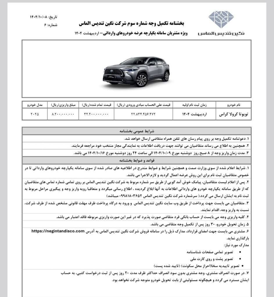 در بخشنامه فروش این خودرو وارداتی، قیمت جدیدی برای تکمیل وجه اعلام شده و این یعنی متقاضیان باید مجددا وجوه درخواستی شرکت را واریز کنند. در حال حاضر مشتریان باید 3 میلیارد و 220 میلیون تومان به حساب شرکت نگین تندیس الماس واریز کنند و اگر به جدول زیر نگاهی بیندازید، متوجه خواهید شد که کمتر از یک سال، قیمتها به شدت تغییر کردهاند.