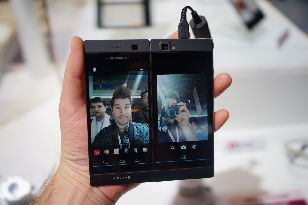 NEC Medias W N05-E (انحصاری ژاپن) دو نمایشگر ۴٫۳ اینچی qHD داشت که صفحه دوم آن پشت قرار میگرفت. با وجود امکان اجرای دو برنامه یا آینهای کردن محتوا، حاشیه بزرگ بین صفحات و عدم پشتیبانی اپلیکیشنها کاربرد این گوشی تاشو را محدود کرد.