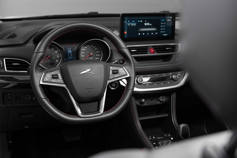 المان جذاب بعدی که توانسته نمای کابین را از سادگی و یکنواخت بودن خارج کند، طرح فیبر کربن روی داشبورد است. این طرح به سرنشینان حس خوبی انتقال میدهد. در قسمت بالای داشبورد نیز یک صفحه نمایش مولتی مدیا قرار گرفته که طراحی کابین را به روزتر از قبل کرده است. همچنین به لطف این نمایشگر، دسترسی به بخشهای مختلف راحتتر شده است.