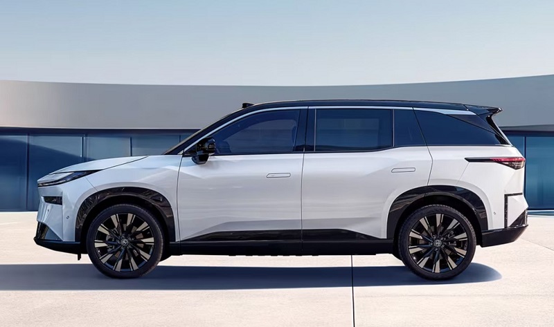 پروفیل جانبی تویوتا bZ3X پخته است و به بلوغ رسیده و حتی میتوان گفت که تکامل یافتهترین قسمت زبان طراحی سری بی زد محسوب میشود. از نمای کناری، کشیدگی کاپوت کمتر به چشم میآید و بخش صندوق عقب ظاهری صاف دارد. برآمدگیهایی در قسمت گلگیر دیده میشود که حض عضلانی بودن این خودرو برقی را تقویت میکند.