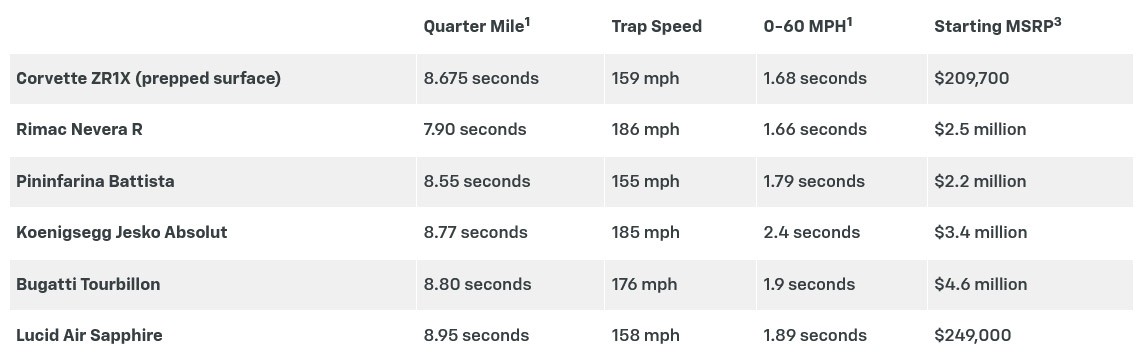 Corvette ZR1X توانست مسافت یکچهارم مایل را در ۸٫۶۷۵ ثانیه و با سرعت ۲۵۵ کیلومتر بر ساعت (۱۵۹ مایل بر ساعت) طی کند. این آزمایش با استفاده از بنزین معمولی، لاستیکهای استاندارد و کالیبراسیون موتوری قانونی برای تمام ۵۰ ایالت آمریکا انجام شد. در همین حین، ZR1X شتاب صفر تا ۹۶ کیلومتر بر ساعت (۰ تا ۶۰ مایل بر ساعت) ۱.۶۸ ثانیهای را به ثبت رساند. این خودرو در کمتر از ۳۰ متر (۱۰۰ فوت) به سرعت ۹۶ کیلومتر بر ساعت رسید و شتاب جانبی ۱.۷۵G را تولید کرد. با این رکوردها، کوروت ZR1X از لوسید ایر سفایر (Lucid Air Sapphire) که شتاب صفر تا ۹۶ کیلومتر بر ساعت ۱.۸۹ ثانیهای و زمان یکچهارم مایل ۸.۹۵ ثانیهای داشت، پیشی گرفت.