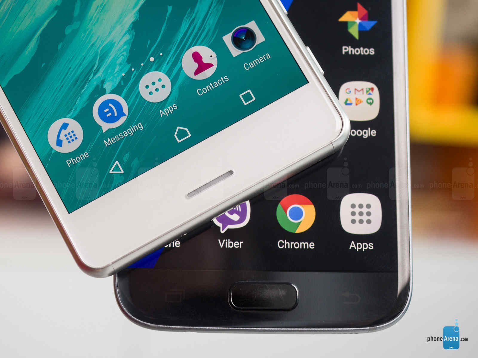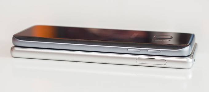 با اینکه حسگر اثرانگشت در تلفن هوشمند سونی به بخش کناری محصول (در دکمه پاور) منتقل شده است، اما ضریب صفحه نمایش به بدنه در پنل جلویی پرفورمنس هنوز هم پایین است. در واقع صفحه نمایش 5 اینچی این محصول، حدود 67 درصد از بخش جلویی دستگاه را به خود اختصاص داده است. دلیل اصلی این موضوع، قرار گرفتن اسپیکرهای دستگاه در پنل جلویی است که متاسفانه با توجه به میزان فضا، آنچنان صدای استریو و مناسبی را تولید نمیکنند. حسگر اثرانگشت در گلکسی اس 7 بر روی دکمه هوم تعبیه شده است، اما با این حال ضریب صفحه نمایش به بدنه در این محصول بسیار بهتر است.