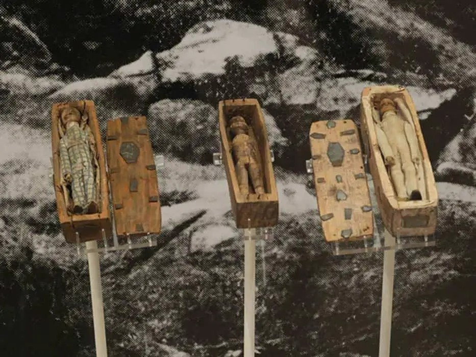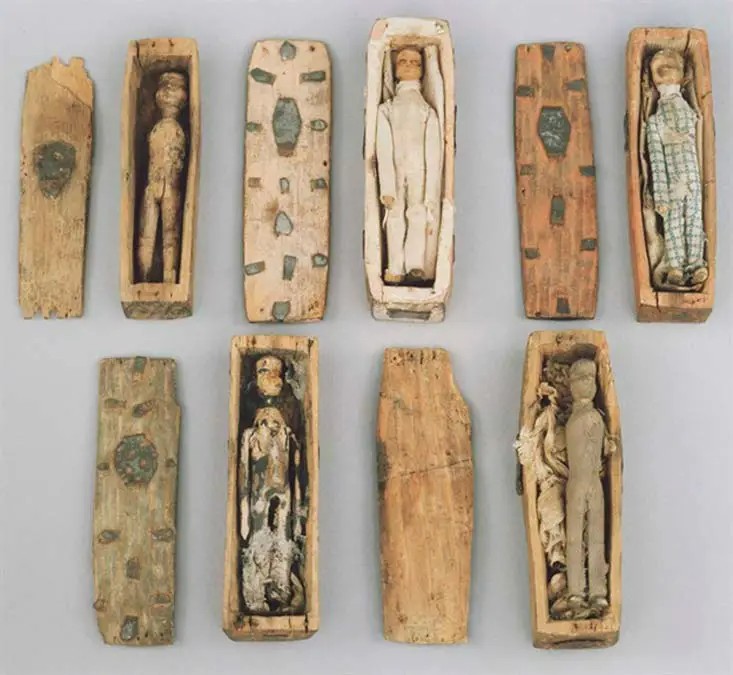 هر یک از این تابوتهای چوبی، که طولی حدود ۷ تا ۱۰ سانتیمتر دارند، از یک تکه چوب ساخته شدهاند و حاوی یک پیکره انسانی کوچک و دقیق هستند. این پیکرهها با لباسهای نخی پوشانده شده و با دقت فراوان، جزئیات مراسم تدفین را تداعی میکنند.
