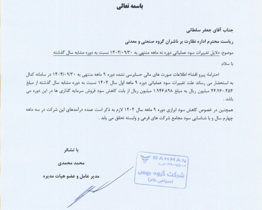 محمد محمدی، مدیرعامل شرکت بهمن موتور در نامهای خطاب به جعفر سلطانی، رئیس اداره نظارت بر ناشران گروه صنعتی و معدنی، به تشریح دلایل افت قابلتوجه سود عملیاتی این شرکت در دوره ۹ ماهه منتهی به ۳۰ آذرماه ۱۴۰۴ پرداخت. بر اساس اطلاعات ارائهشده در این گزارش، سود عملیاتی گروه بهمن در این دوره از ۴۴٬۲۶۰٬۴۵۴ میلیون ریال (معادل ۴ هزار و ۴۲۶ میلیارد تومان) در مدت مشابه سال قبل، به ۱٬۹۴۶٬۸۹۸ میلیون ریال (حدود ۱۹۴ میلیارد تومان) کاهش یافته است که نشاندهنده افتی معادل ۴ هزار و ۲۳۱ میلیارد تومان در سود عملیاتی شرکت است.