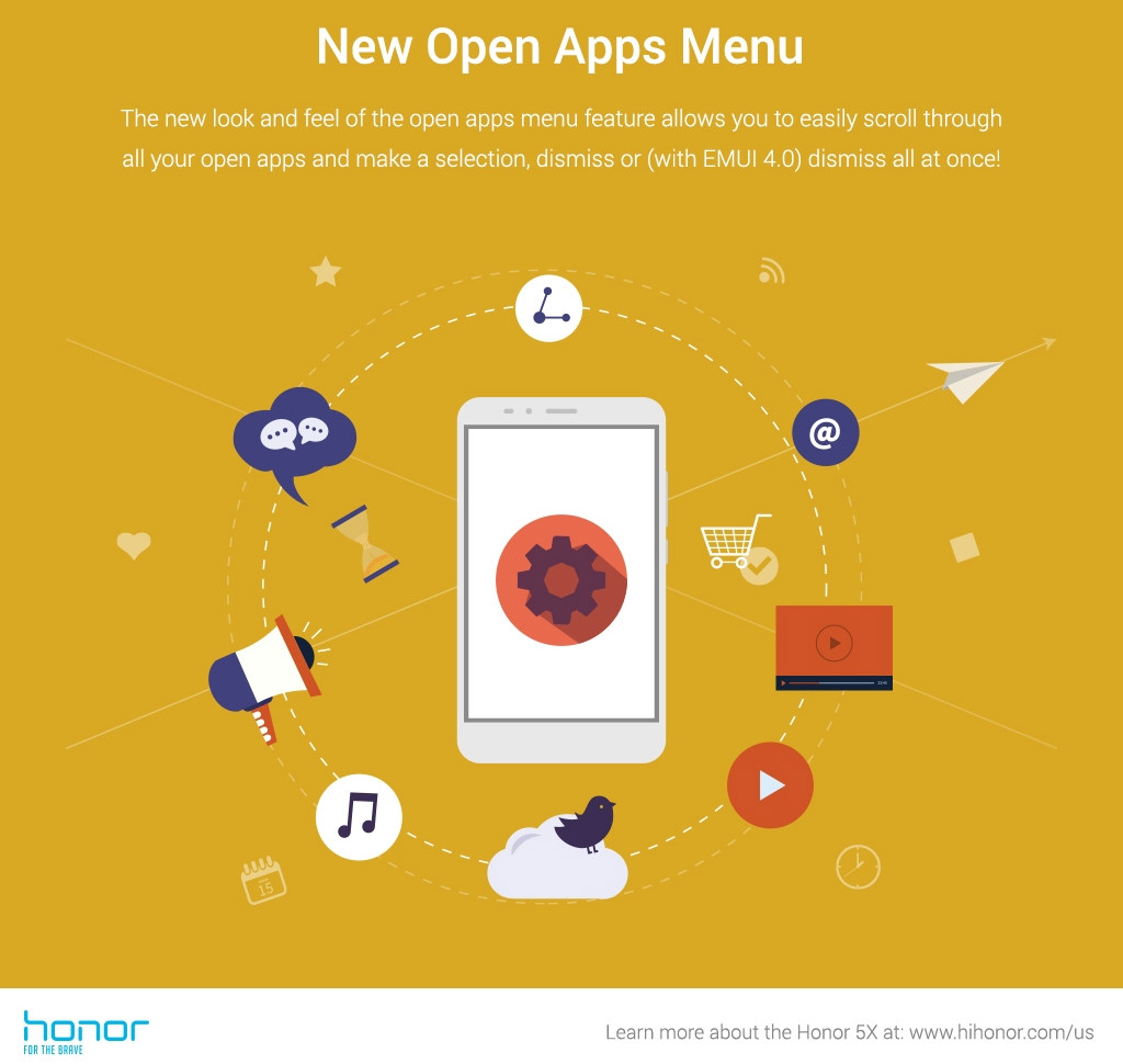آپدیت اندروید 6.0 مارشمالو برای آنر 5 ایکس با رابط کاربری اختصاصی EMUI 4.0 هواوی همراه شده است که در برخی دیگر از تلفنهای هوشمند هواوی نیز قرار گرفته است. بنابراین علاوه بر قابلیتهای شناخته شده و پر طرفداری همچون Google Now on Tab و Doze در اندروید مارشمالو، کاربران آنر 5 ایکس هواوی میتوانند از قابلیتهای جالبی همچون کنترل موشن (نظیر چرخاندن محصول جهت بی صدا شدن آن)، نوار ابزار شخصی سازی شده و حالت استفاده یک دست بهره ببرند. تمامی امکانات و ویژگیهای آپدیت اندروید 6.0 مارشمالو برای آنر 5 ایکس را میتوانید در تصاویر اینفوگرافیک که در ادامه آمدهاند مشاهده کنید.