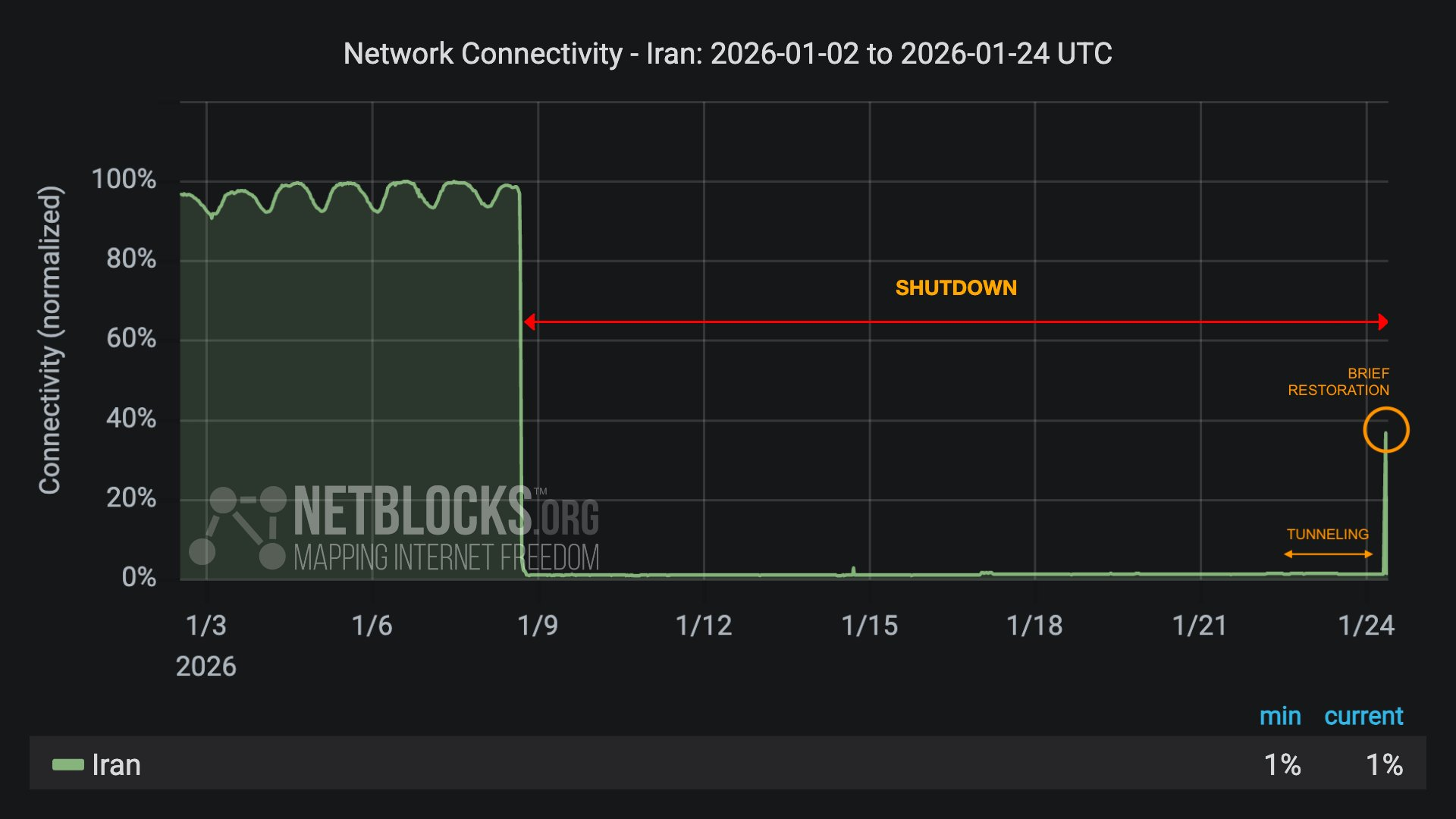 این گزارش همسو با دادههای رادار کلادفلر است که ساعاتی پیش رسیدن ترافیک به سطح ۶۰ درصد را نشان میداد. نتبلاکس تصریح کرده است که این بازگشت ترافیک، به منزله رفع فیلتر پلتفرمهای محبوب (مثل اینستاگرام و واتساپ) نیست، بلکه به معنای برقراری مجدد دسترسی به «اینترنت جهانی» و سرویسهای پایه است.