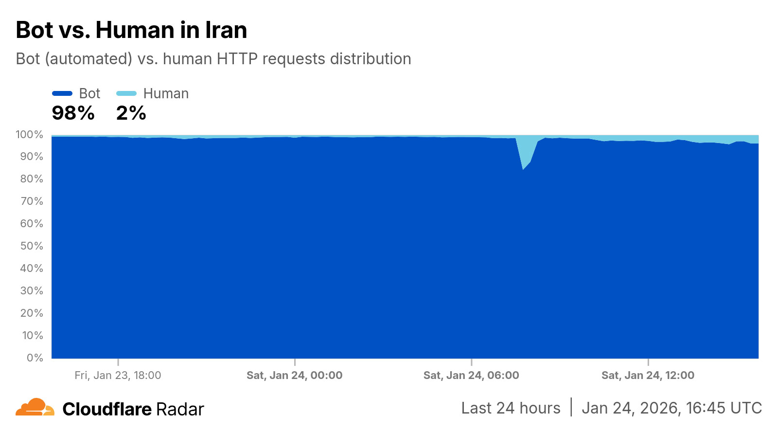 در حالی که در ساعات وصل شدن اینترنت، سهم ترافیک انسانی رو به افزایش بود، آمارهای لحظهای نشان میدهد که دوباره ۹۸ درصد ترافیک ایران توسط رباتها (Bots) تولید میشود.