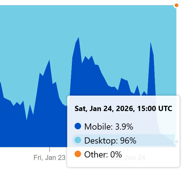 نگاهی به نمودارهای میانگین ۲۴ ساعته، نکته جالبی را ثابت میکند: سهم موبایل در این بازه ۲۸ درصد ثبت شده است.