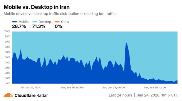 اما بررسی دادههای لحظهای رادار کلادفلر در ساعت ۲۰:۰۰، روی دیگر سکه را نشان میدهد. پس از آن دوره وصل شدن موقت، اکنون سهم ترافیک موبایل با یک سقوط آزاد به ۳.۹ درصد رسیده است.