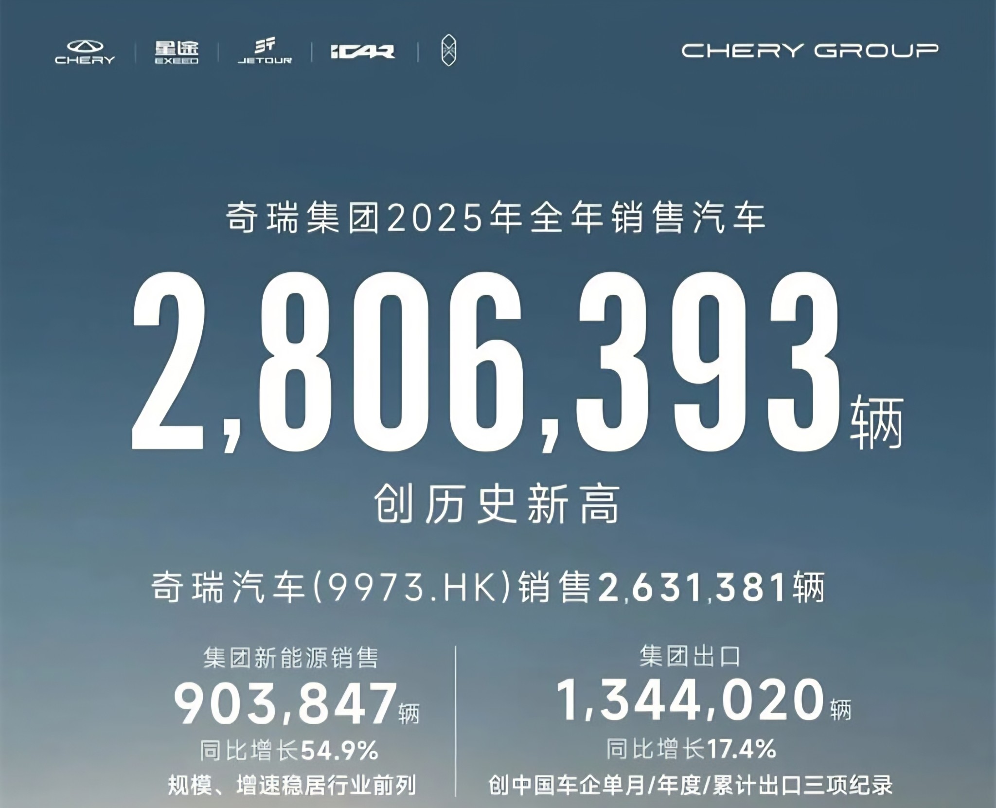گروه چری در سال ۲۰۲۵ با فروش ۲,۳۱۵,۲۷۵ دستگاه SUV، عنوان پرفروشترین برند شاسیبلند چینی در بازار جهانی را به خود اختصاص داد. این گروه در مجموع ۲,۸۰۶,۳۹۳ دستگاه خودرو به فروش رساند که رشدی ۷.۸ درصدی نسبت به سال قبل را نشان میدهد. صادرات نیز سهم قابل توجهی داشت؛ ۱,۳۴۴,۰۲۰ دستگاه خودرو صادر شد که ۱۷.۴ درصد افزایش سالانه را تجربه کرد و ۴۷.۹ درصد از کل فروش این شرکت را تشکیل داد. در بخش خودروهای انرژی جدید (NEV)، چری با فروش ۹۰۳,۸۴۷ دستگاه، رشد ۵۴.۹ درصدی را به ثبت رساند.