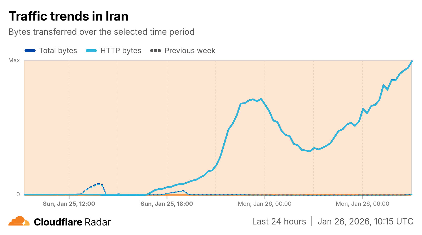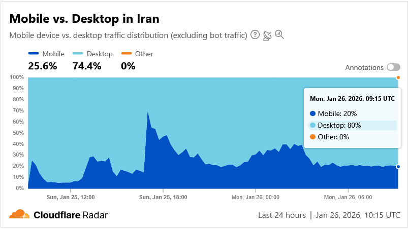جدیدترین آمارهای استخراج شده از رادار کلادفلر (Cloudflare Radar) در ظهر دوشنبه ۶ بهمنماه، نشان میدهد که اگرچه اینترنت از وضعیت «خاموشی مطلق» فاصله گرفته، اما ناپایداری شدید همچنان گریبانگیر کاربران است. همزمان، نتبلاکس از تلاش برای بستن حفرههای فیلترشکن خبر داده و گزارشهای کاربران نیز از وصل شدن اینترنت همراه اول در برخی نقاط حکایت دارد.