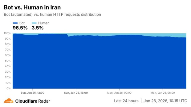 مقایسه ترافیک ربات و انسان (میانگین ۲۴ ساعت گذشته)؛ سهم ناچیز ۳.۵ درصدی کاربران واقعی نشان میدهد که اینترنت هنوز برای «مردم» به حالت عادی برنگشته است.