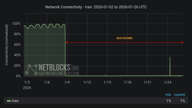 «قطعی اینترنت ایران وارد هجدهمین روز خود شد… در همین حال، حفرههای موجود در فیلترنت (Filternet) در حال سفتوسختتر شدن هستند تا امکان دور زدن محدودیتها محدود شود؛ در حالی که حسابهای کاربری لیست سفید به فعالیت خود ادامه میدهند.»