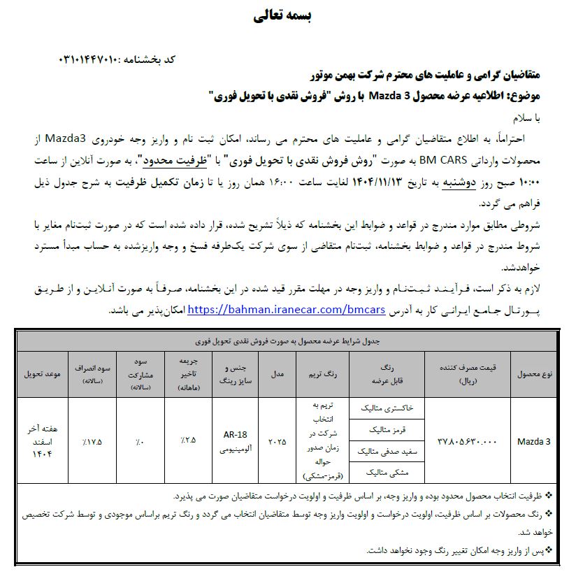 - شرایط فروش مزدا 3 بهمن موتور با قیمت قطعی – بهمن 1404