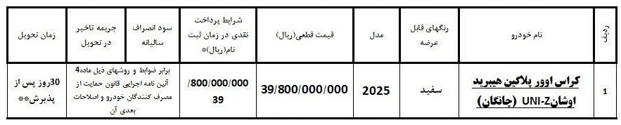 برچسب قیمتی اوشان یونی زد پلاگین هیبرید از سوی کریمان موتور، 3 میلیارد و 980 میلیون تومان اعلام شده است. این خودرو وارداتی با رنگ سفید و مدل 2025 و موعد تحویل 30 روز پس از پذیرش راهی بازار میشود. تمام مبلغ خودرو در یک مرحله واریز میگردد و سود انصراف سالیانه و جریمه تأخیر در تحویل به صورت ماهانه، برابر ضوابط و روشهای ذیل ماده 4 آیین نامه اجرایی قانون حمایت از مصرف کنندگان خودرو و اصلاحات بعدی آن محاسبه خواهد شد.
