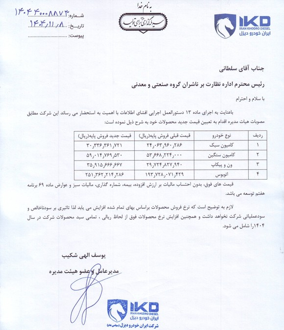 شرکت ایران خودرو دیزل با انتشار یک دستورالعمل جدید، از افزایش قابل توجه قیمت محصولات سبک و سنگین خود خبر داد.
