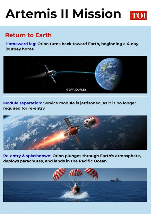 اوریون پس از دور زدن ماه و استفاده از گرانش آن، در یک مسیر بازگشت دقیق قرار میگیرد که آن را بدون نیاز به نیروی پیشرانش عمده، مستقیماً به اتمسفر زمین و فرود در اقیانوس آرام هدایت میکند.