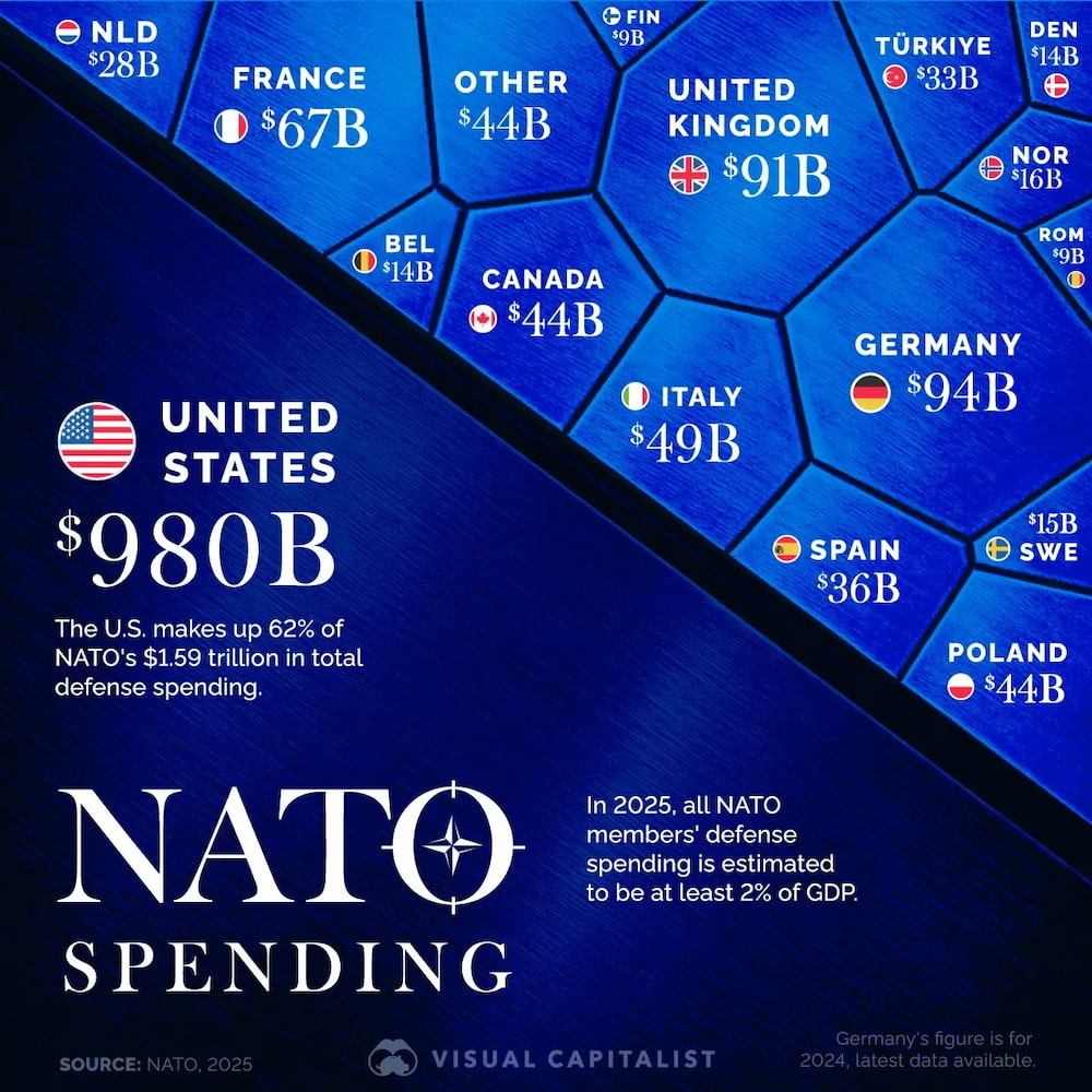 دادههای موجود در تصویر بالا بر پایه تازهترین گزارش رسمی ناتو گردآوری شده و شامل هزینههای سال ۲۰۲۴ آلمان نیز میشود که آخرین اطلاعات در دسترس از این کشور به شمار میرود. بر اساس این گزارش، ایالات متحده با برآورد حدود ۹۸۰ میلیارد دلار هزینه دفاعی که معادل ۶۲ درصد از کل بودجه ۱.۵۹ تریلیون دلاری ناتو میشود، همچنان نقش تعیینکننده در این پیمان دارد. این سهم عظیم نهتنها نشانهای از قدرت اقتصادی و نظامی آمریکا، بلکه الگویی از وابستگی ساختاری ناتو به منابع و زیرساختهای دفاعی واشنگتن است.