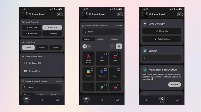 این برنامه دکمههای تنظیم صدا را به ابزار اسکرول تبدیل میکند تا بدون لمس صفحه و کثیف شدن نمایشگر بتوانید محتوا را بالا و پایین کنید. اگر هنگام غذا خوردن میخواهید اخبار بخوانید یا از درد انگشت شست و خستگی دست رنج میبرید این ابزار بهترین گزینه برای شماست.