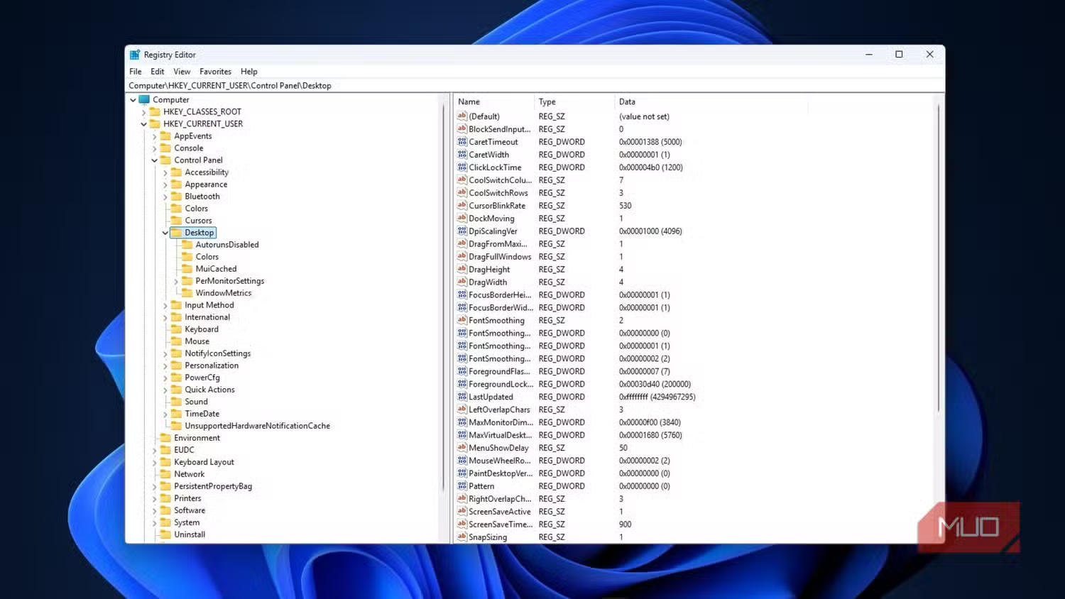 ۲. در پنجره باز شده به مسیر زیر بروید: HKEY_CURRENT_USER\Control Panel\Desktop