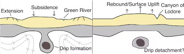 ماجرا به پدیدهای به نام ریزش لیتوسفر (Lithospheric Drip) بازمیگردد. میلیونها سال پیش، تودهای بسیار سنگین و چگال از سنگهای پوسته زمین در زیر این کوهها ناپایدار شد و مانند قطرهای غلیظ به سمت گوشته زمین (لایه مذاب زیرین) شروع به چکیدن کرد. این نیروی رو به پایین، باعث شد تا سطح زمین و کوههای یوئینتا به سمت پایین کشیده شوند و نوعی گودی ایجاد کنند.