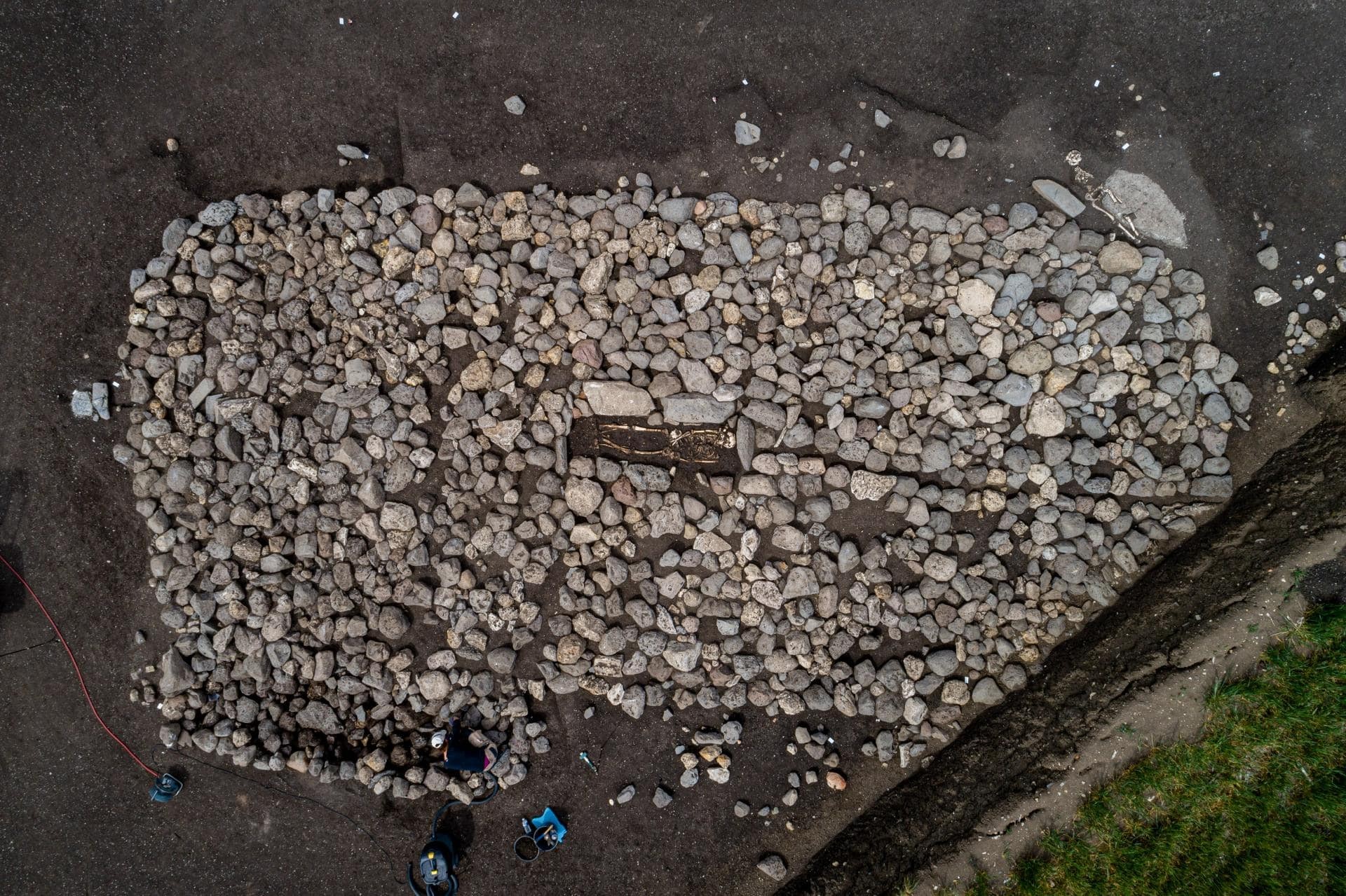 در این محوطه، بقایای یک گورپشته سنگی (cairn) نیز به طول ۱۴ متر و عرض ۶.۵ متر یافت شد که در دوران نوسنگی برای دفن استفاده میشد. این گورپشته چهارگوش، حول یک مقبره ساخته شده بود که بقایای اسکلت یک مرد بلندقامت را در خود جای داده بود. جسد او توسط محفظهای چوبی که اکنون از بین رفته، محافظت شده و با بلوکهایی مهار شده بود.